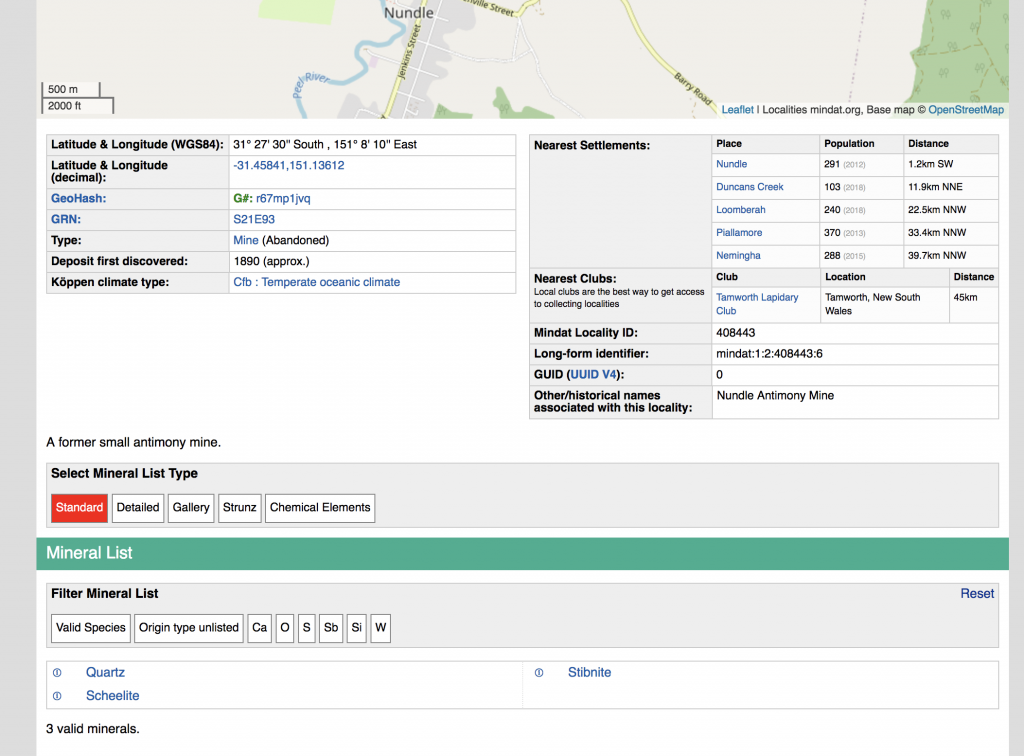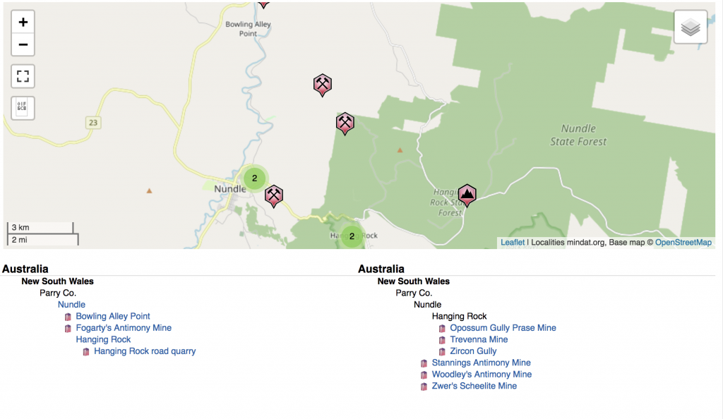 4. You will see the location of sites where minerals have been found. Click on a mining icon or a circle with a number which will bring up more mining icons or more circles. Keep going until you can see an icon where you want to look, and click it. You will see a list of the minerals that have been found there. (I clicked on the circle near Nundle, then one of the icons)