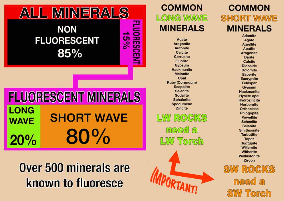 Only about 15% of all minerals fluoresce. Over 500 minerals are known to fluoresce. The problem is that only about 15-20% of them want LW and 80 – 85% want SW. Some are OK in SW or LW, but better in Mid Wave (MW) and vice versa. So if you want to find anything that’s there you should consider having both SW and LW.