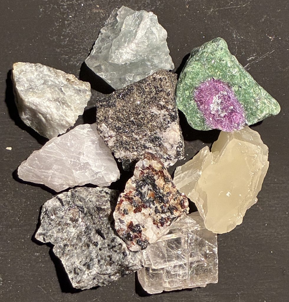[The 9 Long Wave minerals are calcite, calcite rhomb, fluorite, manganocalcite, meionite (formerly wernerite), corundum (ruby), sphalerite, sodalite, willemite on calcite. Can you ID them? Click here for the answer.]