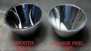There are two types of torch reflectors and they make different beams. One (SMO) has a SMOoth surface. The other’s surface is like Orange Peel (OP).
